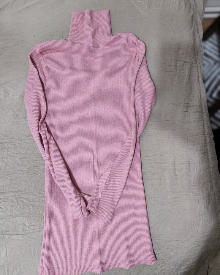 Pembe renkte, balıkçı yaka ve uzun kollu, triko dokulu keten kumaştan yapılmış, vücuda oturan normal midi uzunlukta kadın kazak. Günlük kullanım için uygundur.