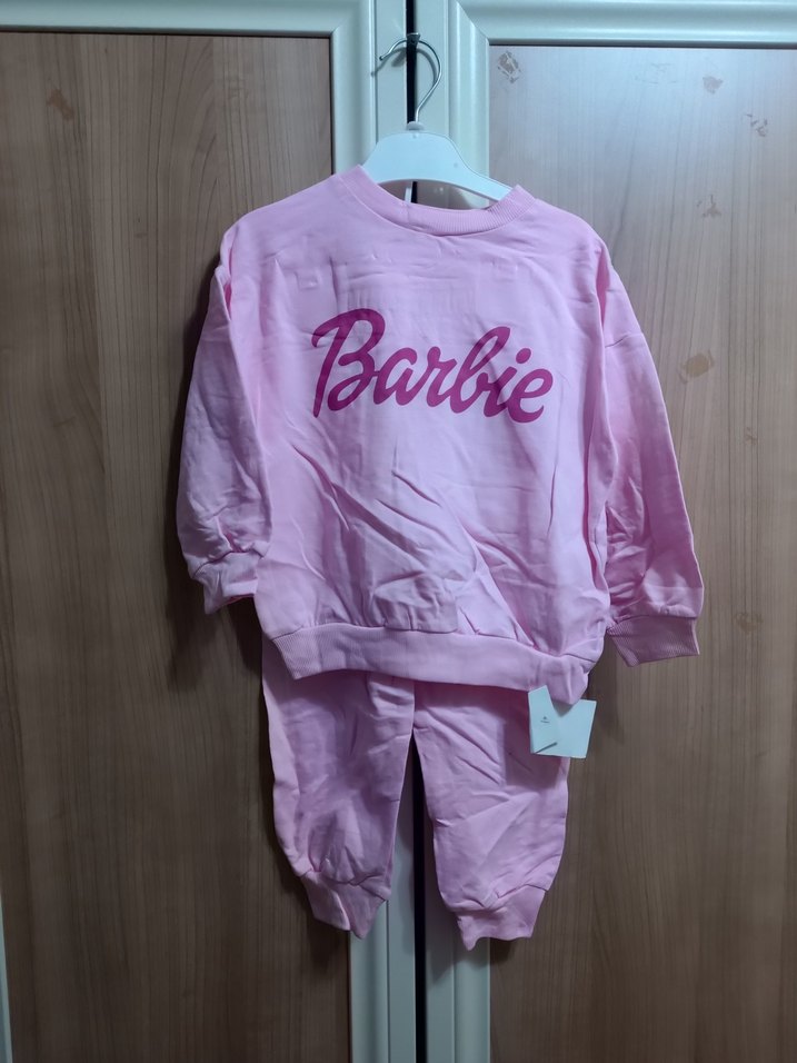 Pembe pastel renkte, Barbie baskılı, bol kesim kız eşofman takımı. Uzun kollu, yuvarlak yakalı ve yumuşak kumaştan üretilmiştir. Fırfır detaylarıyla sokak stiline uygun.