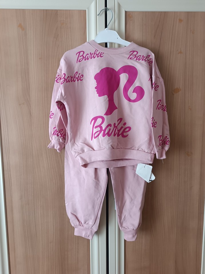 Rahat kesim, uzun kollu, bisiklet yaka pembe Barbie baskılı kız eşofman takımı, yumuşak örme kumaştan üretilmiştir.