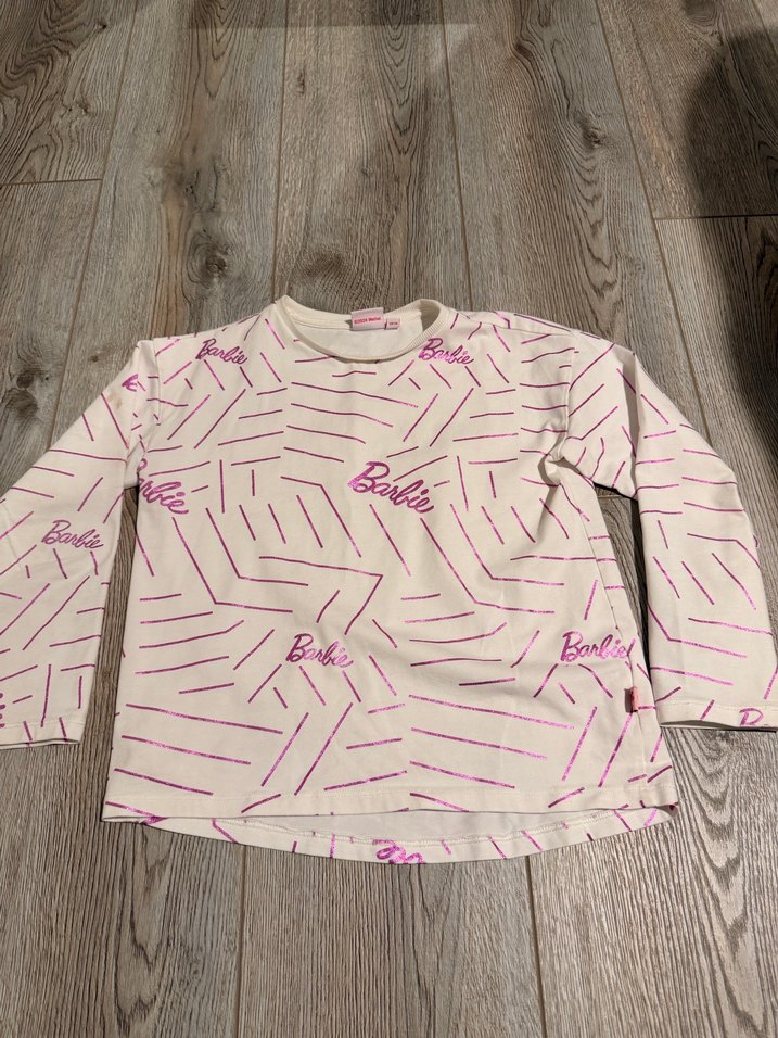 Pembe renkli kız sweatshirtü, uzun kollu, bisiklet yaka ve bol kesimdir. Örgü dokusuna sahip, Barbie baskılı ve pastel tonlardadır, trend sokak stili sunar. Sadece sağ kolun üst kısmında leke var fiyatı ondan uygun tutulmuştur.