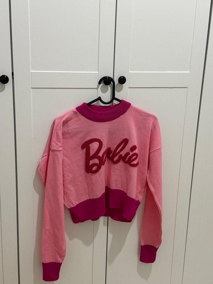 Pembe renkli, uzun kollu, yuvarlak yakalı ve bol kesim kız sweatshirtü. Örme dokusu ve Barbie baskısı bulunur. Yumuşak ve sıcak kumaştan üretilmiştir.