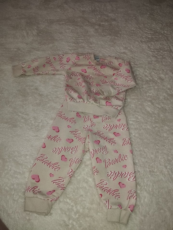 Örgü, uzun kollu bebek kıyafet takımı, pembe pastel Barbie baskılı kalplerle süslenmiş. Rahat ve yumuşak kumaş.