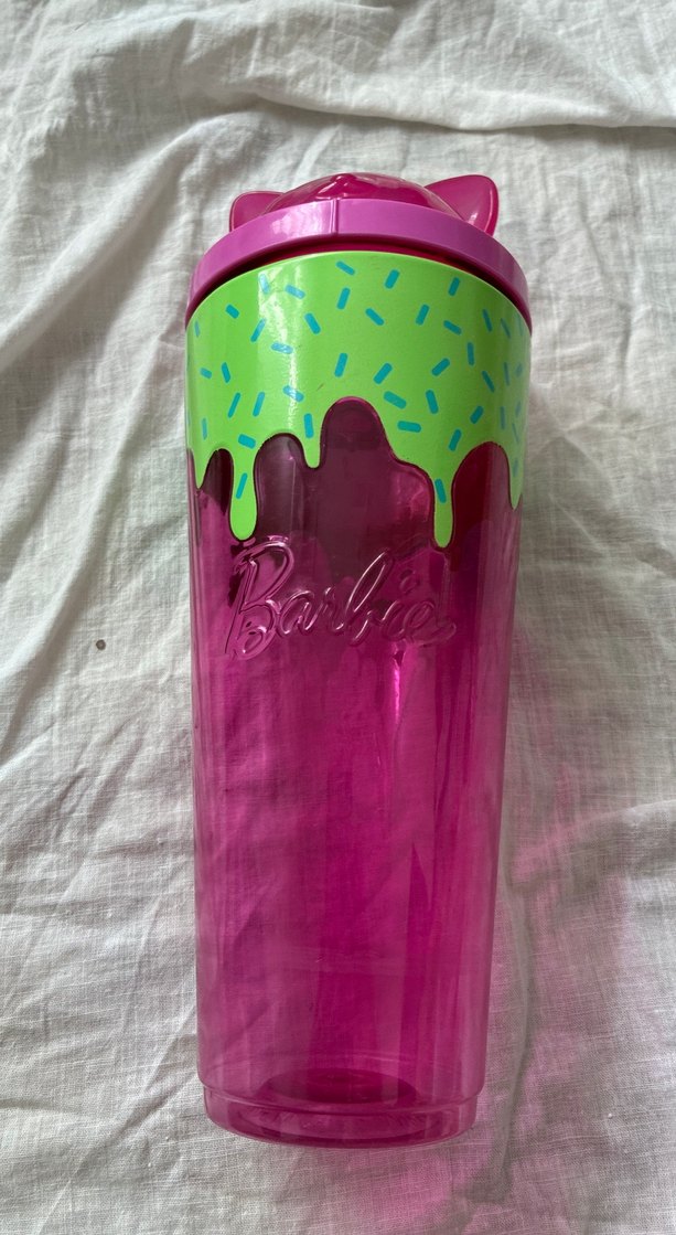 Pembe gövdeli, yeşil ve mavi desenli kapaklı renkli Barbie bebek biberonu. Önde kabartma Barbie logosu bulunur.
