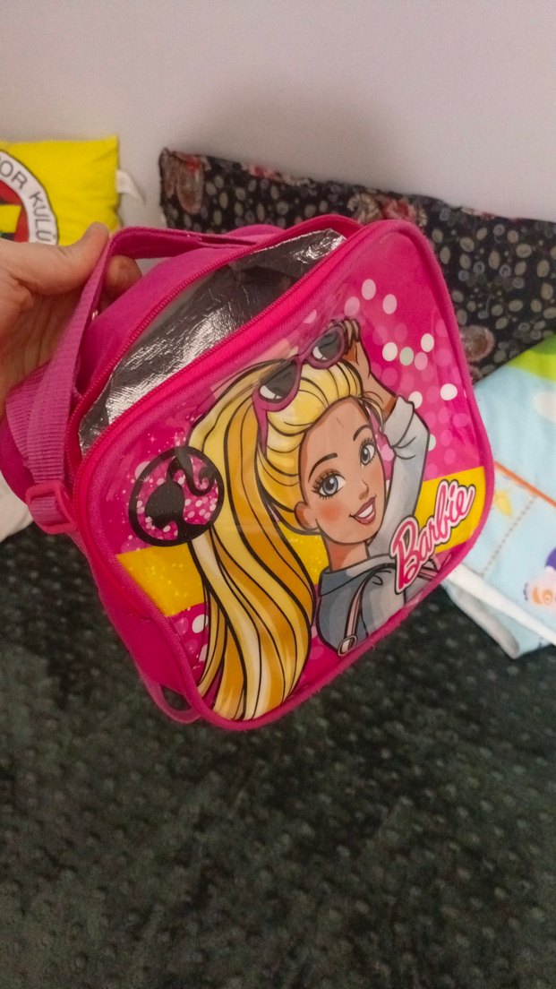 Pembe renkte, Barbie figürlü çocuk beslenme çantası. İç kısmı yiyecekleri taze tutan izolasyonlu malzemeden yapılmıştır.