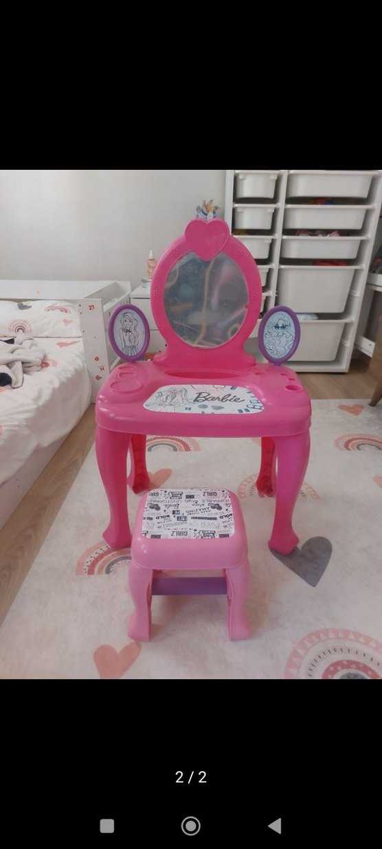 Pembe Barbie oyun masası, kalp şeklinde büyük ayna ve iki küçük yan aynaya sahiptir. Aynı renkte taburesiyle birlikte, çocukların hayal gücünü destekler. iade yok.taburelidir. trendyol vs sitelerdeki fiyatinim cok cok altindadir.