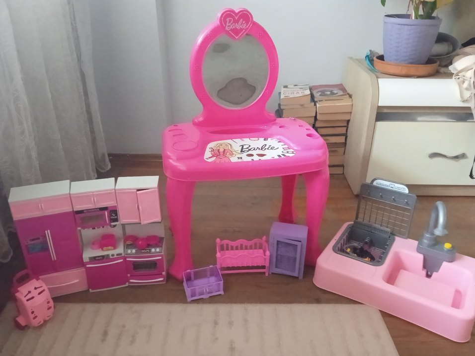 Renkli pembe Barbie çocuk şifonyeri, kalp şeklinde aynaya ve oyunlu detaylara sahip geniş bir üst yüzeye sahiptir. Minyatür mobilya aksesuarları ile birlikte gelir.