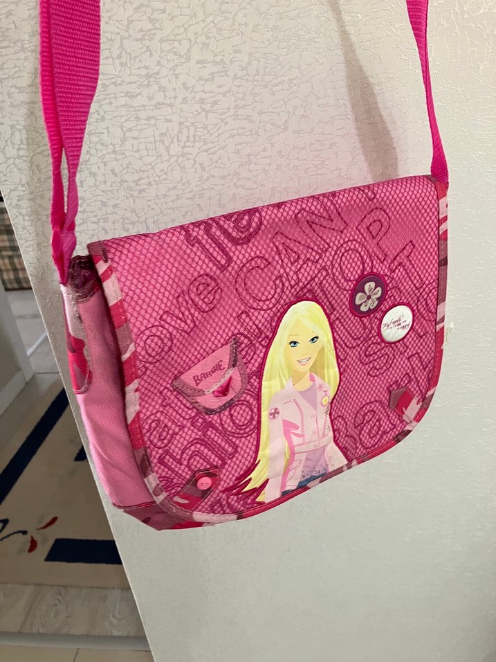 Pembe renkli çocuk okul çantası, renkli Barbie deseni, ayarlanabilir omuz askısı ve kapaklı kapanışa sahiptir.