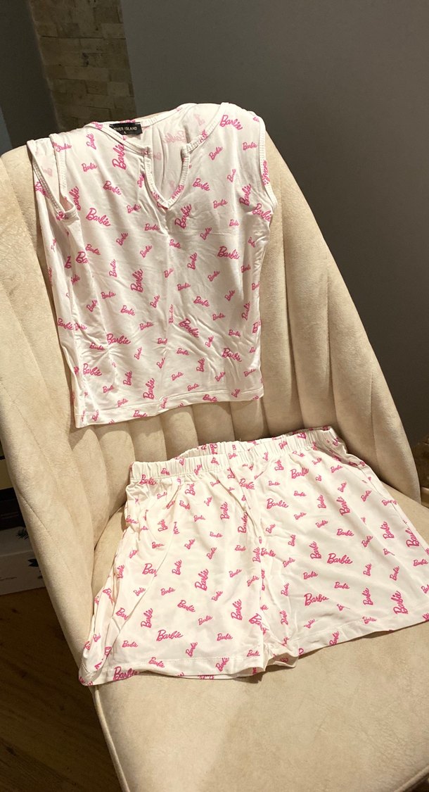 Pembe Barbie baskılı, kolsuz ve dar kesim kısa kadın pijama takımı. Modern tarzıyla rahatlık sunar. L yazdıgına bakmayın kızlar dar kalıp ve cok rahat hiç giymedim