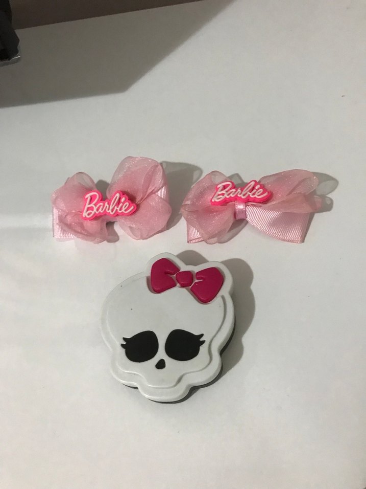 Pembe Barbie logosu baskılı, fiyonk detaylı çocuk saç tokası.Kapaklı ayna.