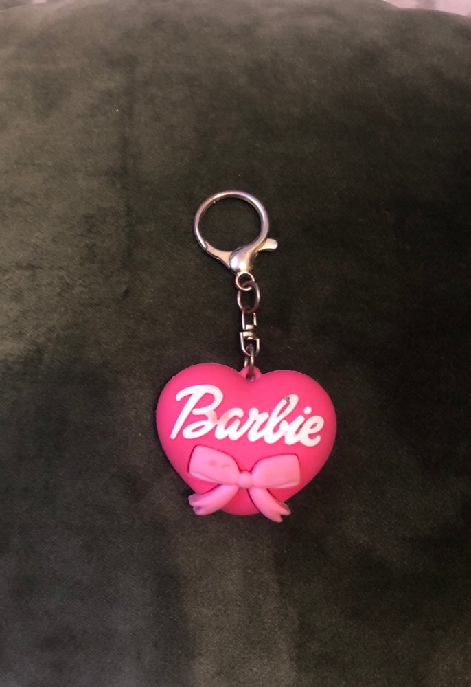 Pembe kalp şeklinde anahtarlık, Barbie logosu ve fiyonk detayıyla cesur ve renkli bir tarz sunar. ️