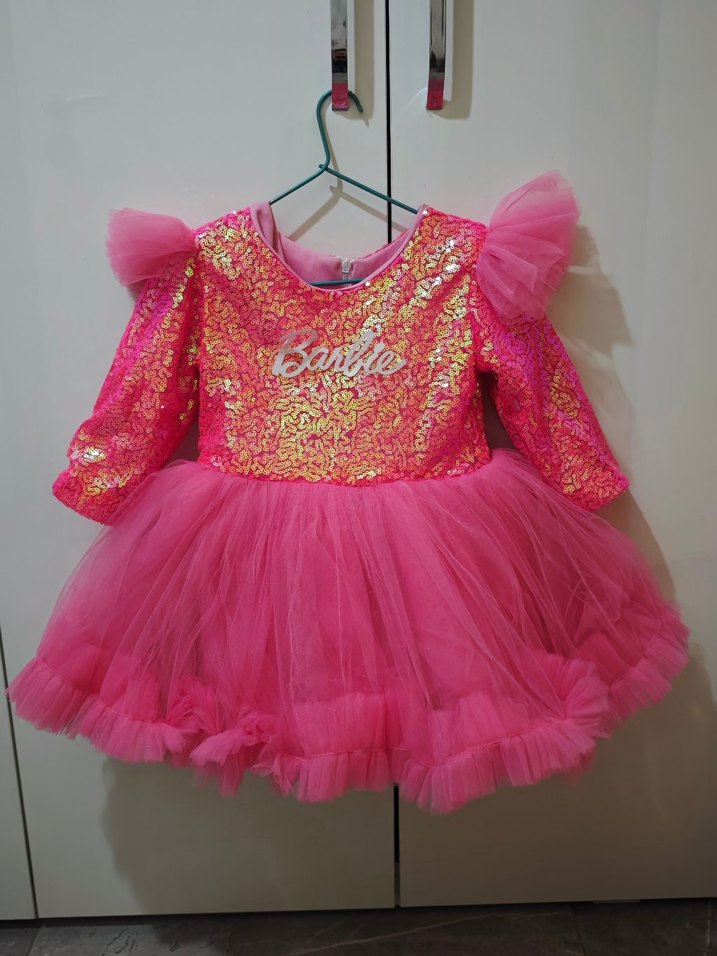 Pembe Barbie Nakışlı Uzun Kollu Kız Elbisesi özel dikim