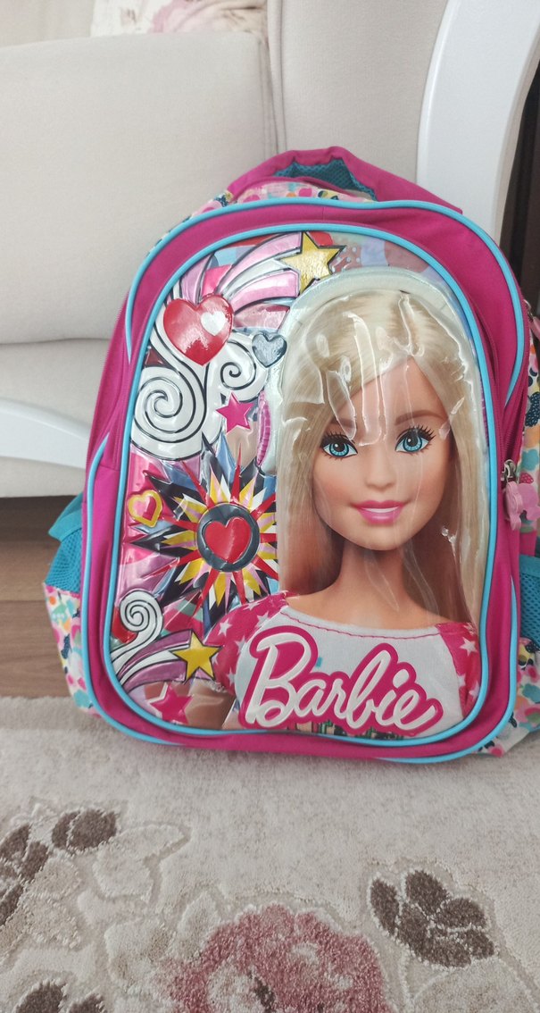 Canlı renklerde, ön cephesinde büyük Barbie figürü bulunan pembe okul çantası. Çocuklar için uygun.