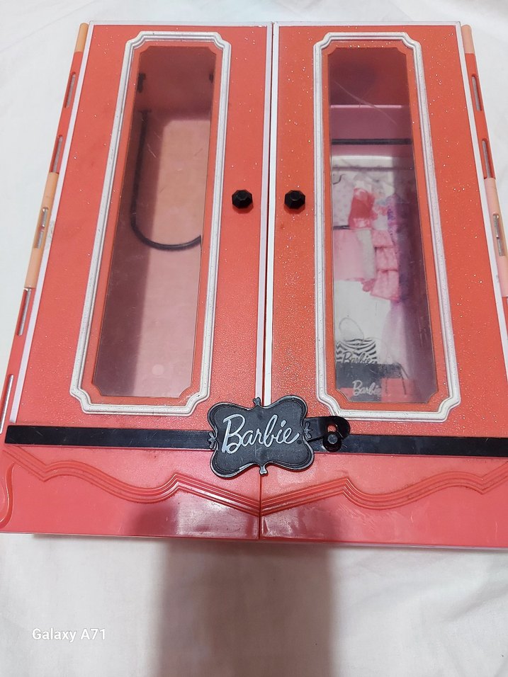 Pembe renkli, şeffaf kapaklı, siyah kulplu Barbie oyuncak dolabı. Önünde Barbie logosu bulunur. Orjinal urun