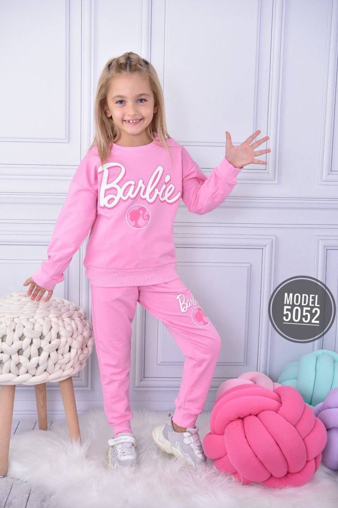 mevsimlik 2 iplik şardonsuz Yumuşak kumaştan, bol kesim pembe sweatshirt ve eşofman takımı. Uzun kollu, bisiklet yaka, payetli Barbie baskılıdır.