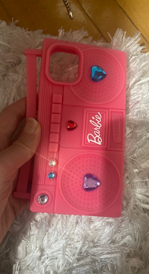 Pembe renkli, Barbie temalı telefon kılıfı, renkli payetli kalp süslemeleriyle pop kültür tarzını yansıtıyor.