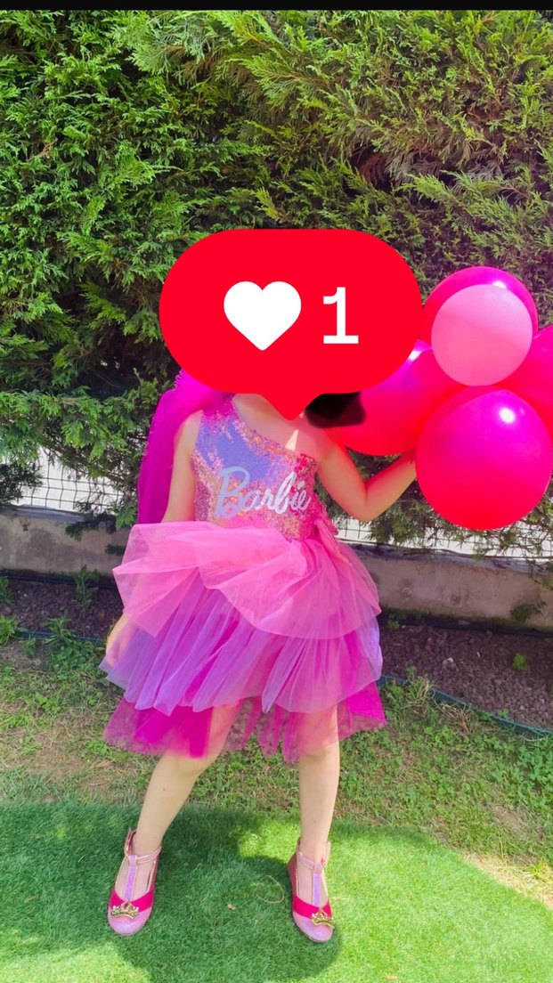 Tek omuzlu, vücuda oturan pembe elbise, renkli batik desen ve fırfırlı katmanlara sahip. Üstü pullu ve Barbie baskısı bulunur.