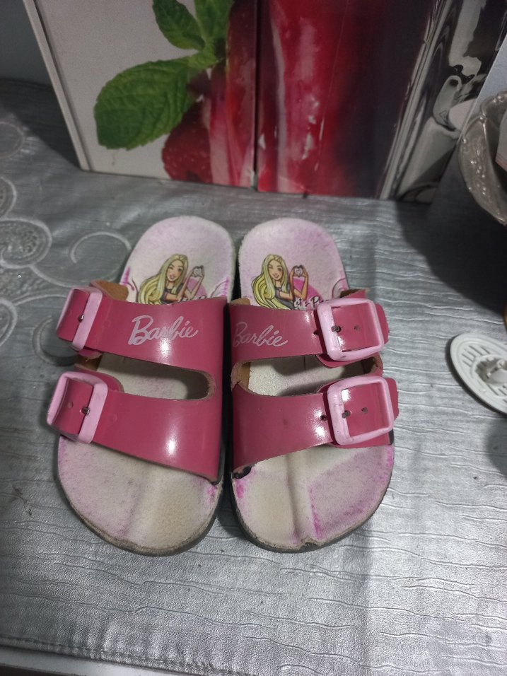 Pembe kauçuk kız terliği, renkli baskılı Barbie deseni ve ayarlanabilir tokalarla bohem, retro tarzı yansıtıyor. profilimden ayakkabı alana hediyemdir