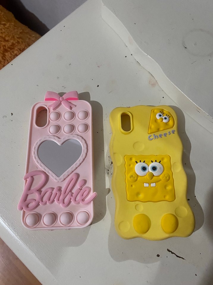 Pastel pembe Barbie telefon kılıfı boncuklu ve kalp aynalı, sarı Sünger Bob kılıfı 3D tasarımlı ve 'Cheese' yazılı. Her ikisi pop kültür tarzında. iphone x ve xs kılıd sayılı kullandım ikisinin fiyatı