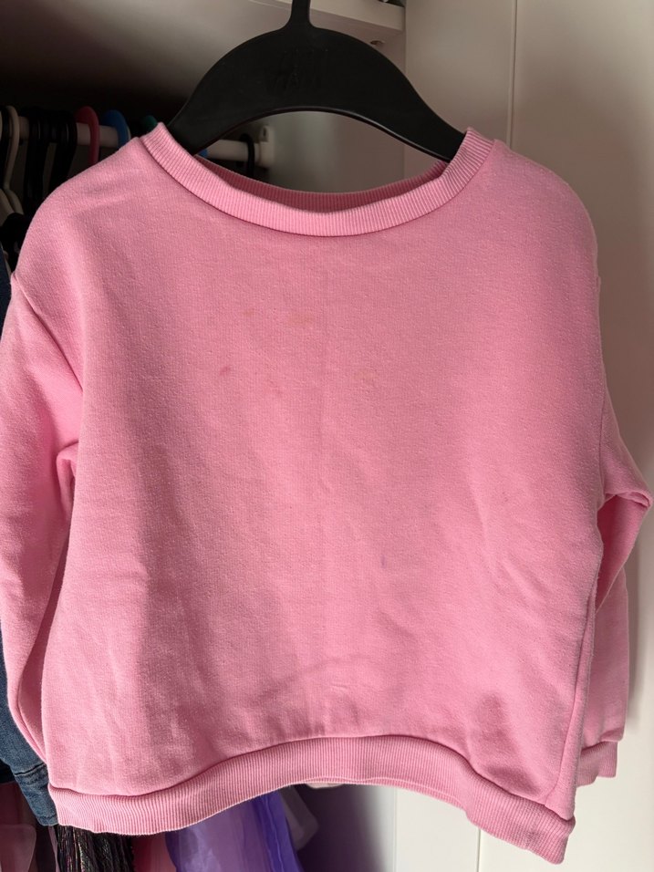Pastel pembe renkte, yuvarlak yakalı ve uzun kollu, rahat kesim kadın sweatshirt. Yumuşak ve sıcak dokusu günlük kullanıma uygundur. Önünde ufak lekeleri var