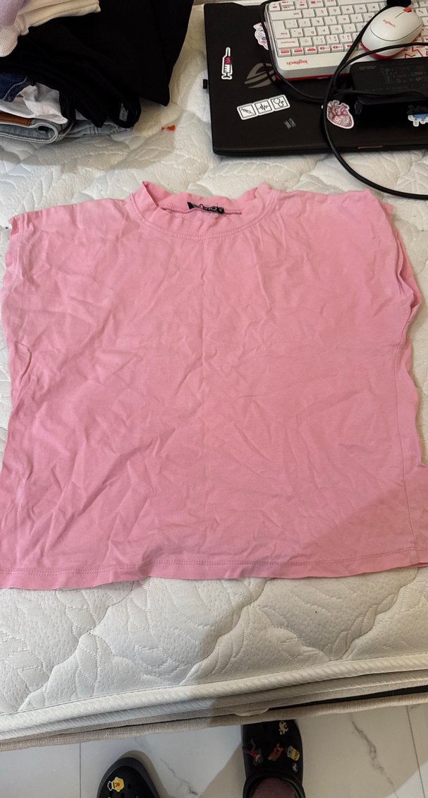 Pembe renkli, keten kumaştan yapılmış kısa kollu ve yuvarlak yakalı bol kesim tişört. Pastel tonuyla günlük kullanıma uygun rahat bir parça.