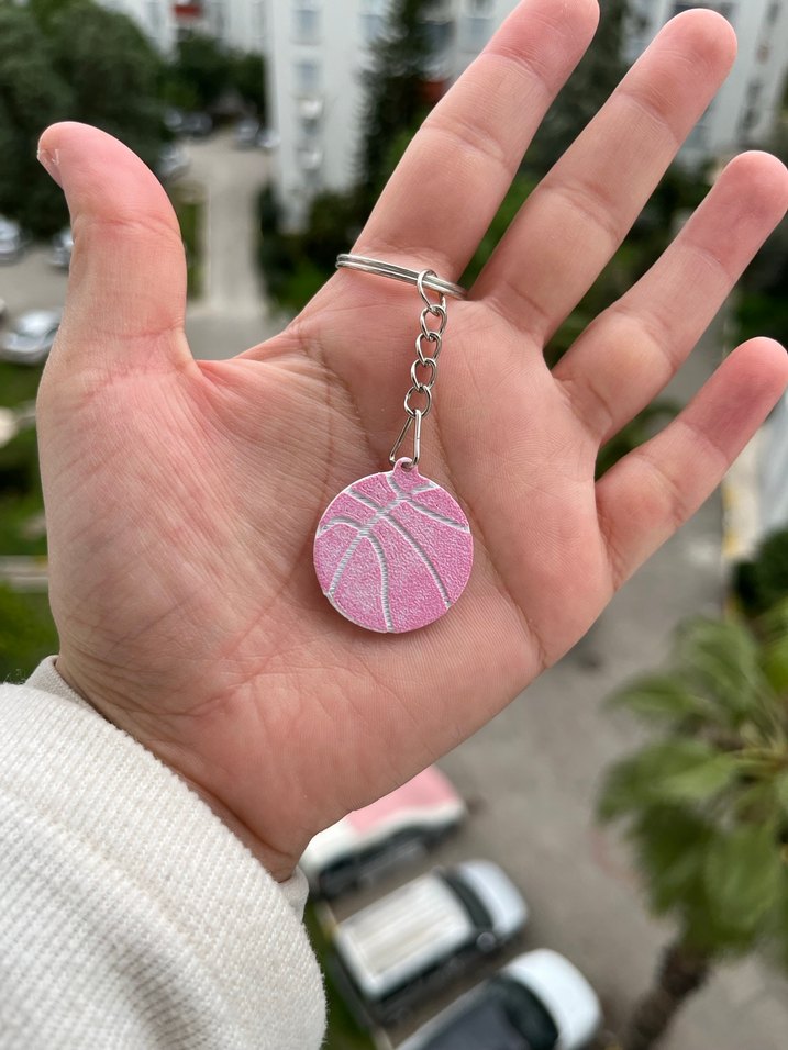Pastel pembe renkli basketbol figürlü, zincir detaylı kadın anahtarlık. Ürün 3d printer ile basılmış olup akrilik boya ile boyanmıştır.