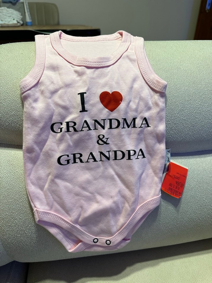 Pembe, askısız bebek body, yuvarlak yaka ve düğmeli kapama ile. Üzerinde 'I ❤️ Grandma & Grandpa' baskısı bulunur.