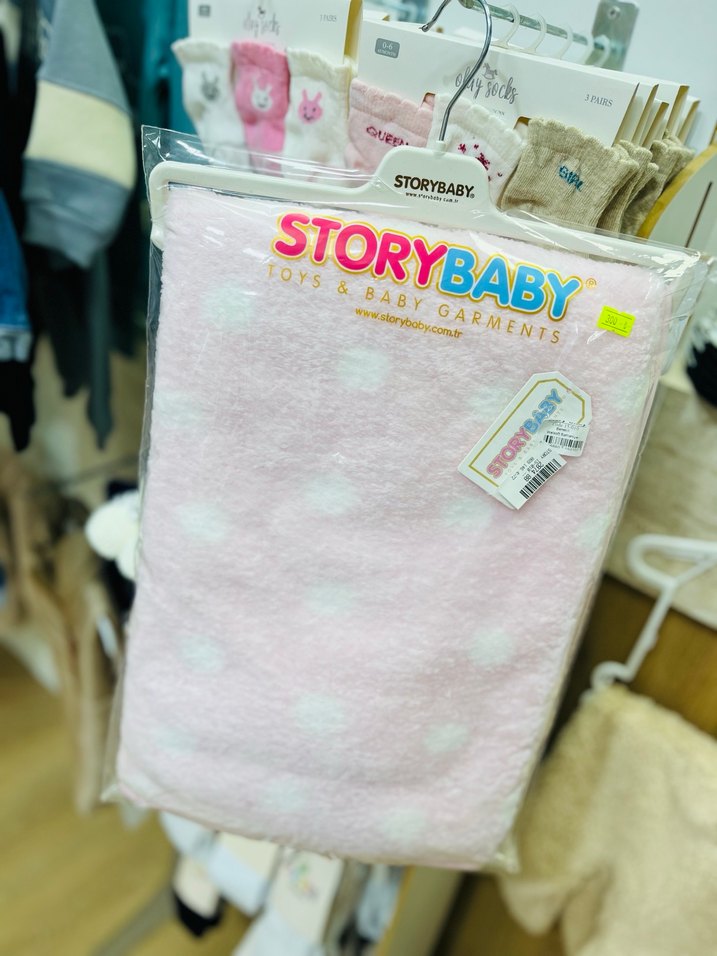 Sentetik kumaştan, pastel baskılı pembe yumuşak bebek battaniyesi. StoryBaby markasına ait.