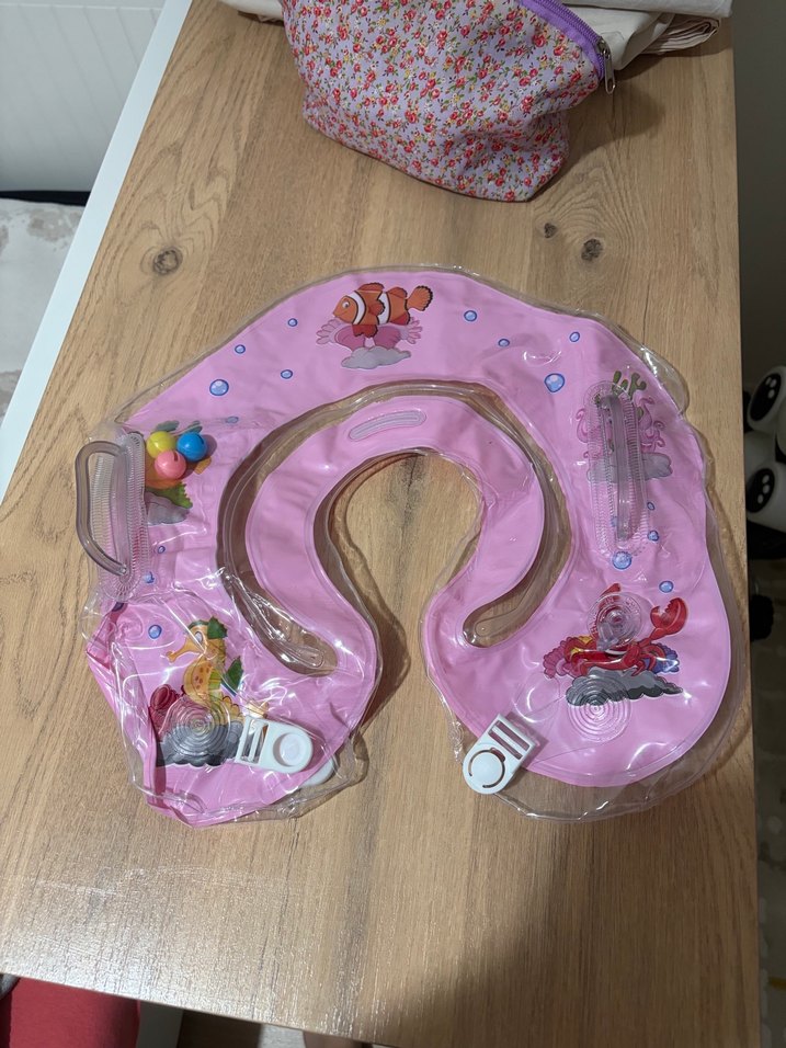 Pastel pembe renkte, deniz canlıları baskılı, yumuşak şişirilebilir malzemeden yapılmış bebek boyunluk, güvenli tokalarla donatılmış. Bebeklerin denize havuza giymesi için boyna takılmaktadır