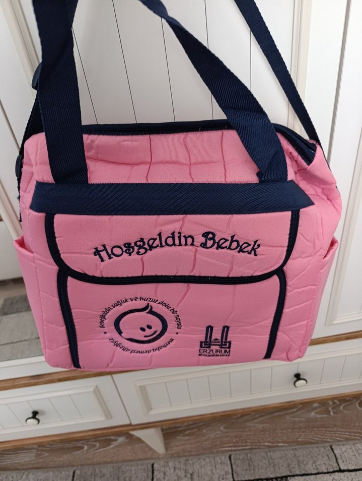 Pastel pembe renkte, baskılı detaylara sahip bebek çantası. "Hoşgeldin Bebek" yazısı ve geniş saklama alanı bulunur.