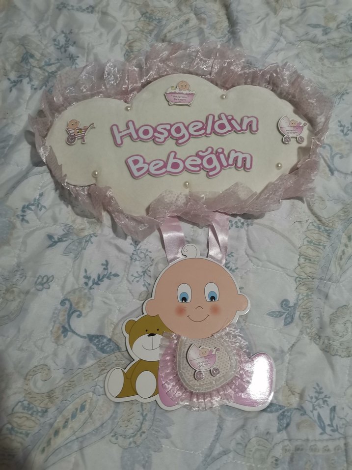 "Hoşgeldin Bebeğim" yazısı ve sevimli bebek ile oyuncak ayı figürleri içerir. Sorunu yok.