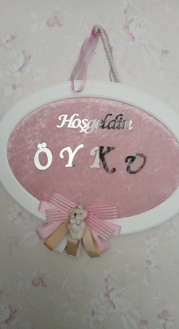 Pastel pembe renkte, "Hosgeldin, öykü baskılı bebek kapı susu. Fiyonk ve küçük peluş detaylıdır.
