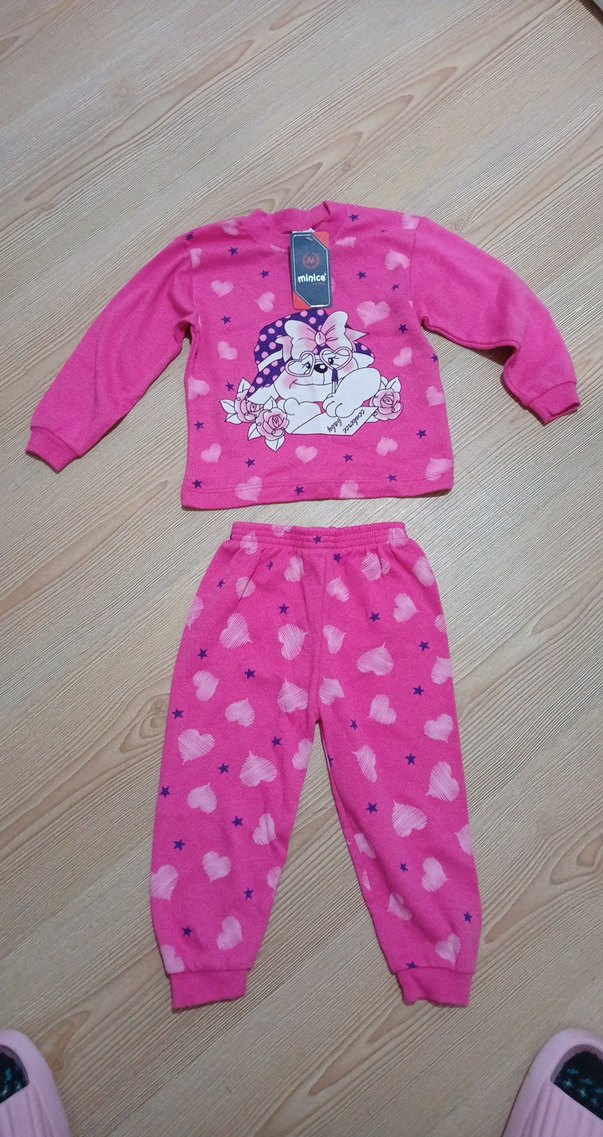 Pembe bebek kız takımı, uzun kollu, renkli baskılı kalpler ve üstte sevimli kedi deseni içerir. Yumuşak ve rahat kumaş. 2 yaş için uygundur