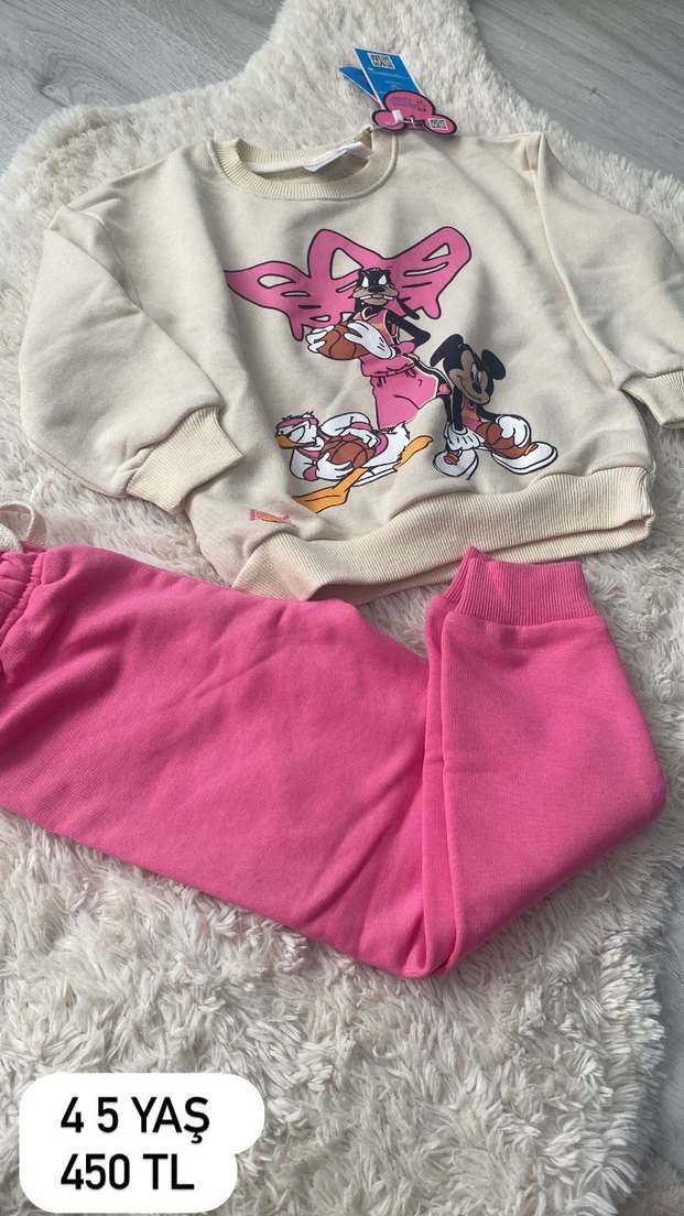 Pastel pembe renkli, baskılı ve uzun kollu bebek kız takımı. Kürklü detaylarla sıcak ve yumuşak bir his sunar.