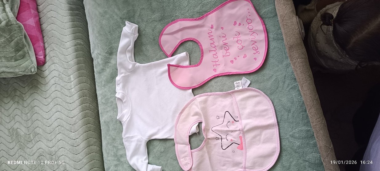 Baskılı desenlere sahip pastel pembe bebek mama önlükleri, yumuşak ve rahat yapıda. Biri yıldız deseni, diğeri Türkçe tatlı mesaj içeriyor.