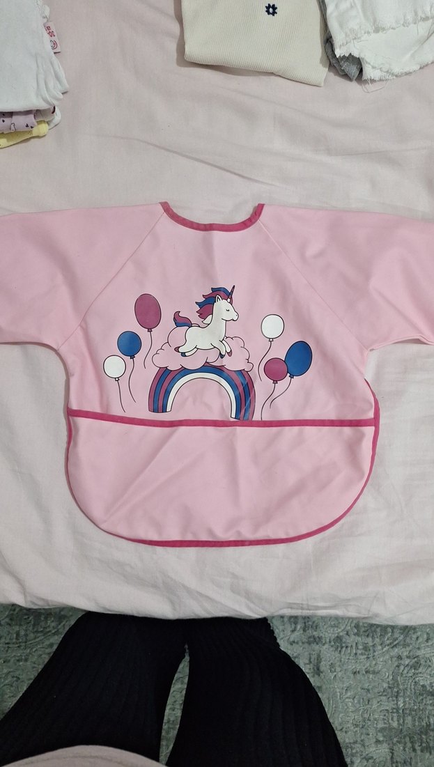 Uzun kollu, yuvarlak yakalı, pembe tonlarında bebek mama önlüğü. Üzerinde unicorn, balonlar ve gökkuşağı baskısı bulunur.