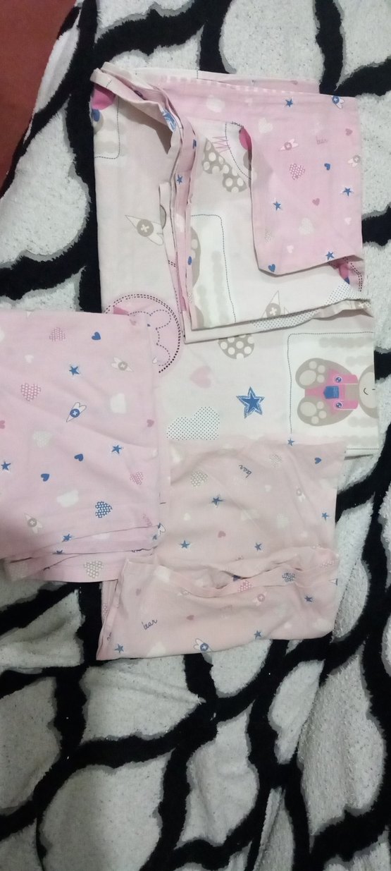 Pastel pembe renkte, baskılı desenli yumuşak pamuk kumaştan bebek uyku seti, rahat ve eğlenceli bir görünüm sunar. (yorgan kılıfı yastık kılıfı çarşaf yastık ve lastikli çarşaf)