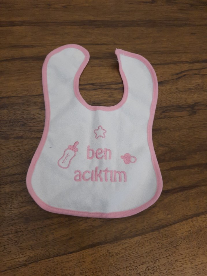 Pastel pembe renkte, "ben aciktim" yazılı baskılı bebek önlüğü. Yumuşak kumaş ve pembe kenarlık içerir.