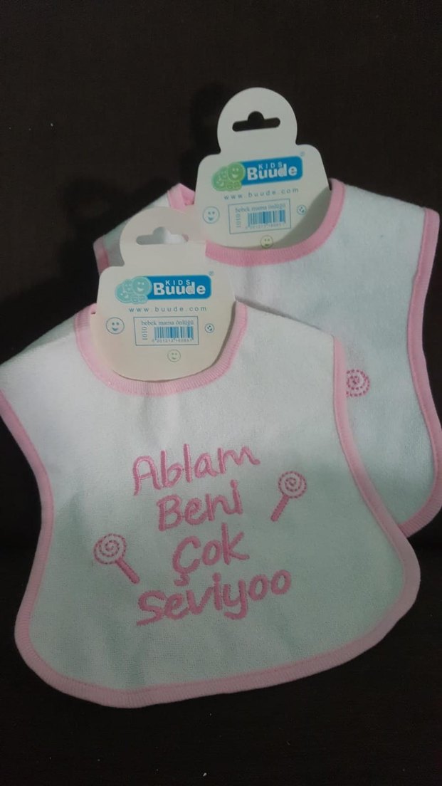 Pembe pastel tonlarda, baskılı "Cok Ablam Seviyoo Beni" yazılı, küçük şeker desenli yumuşak bebek önlüğü.