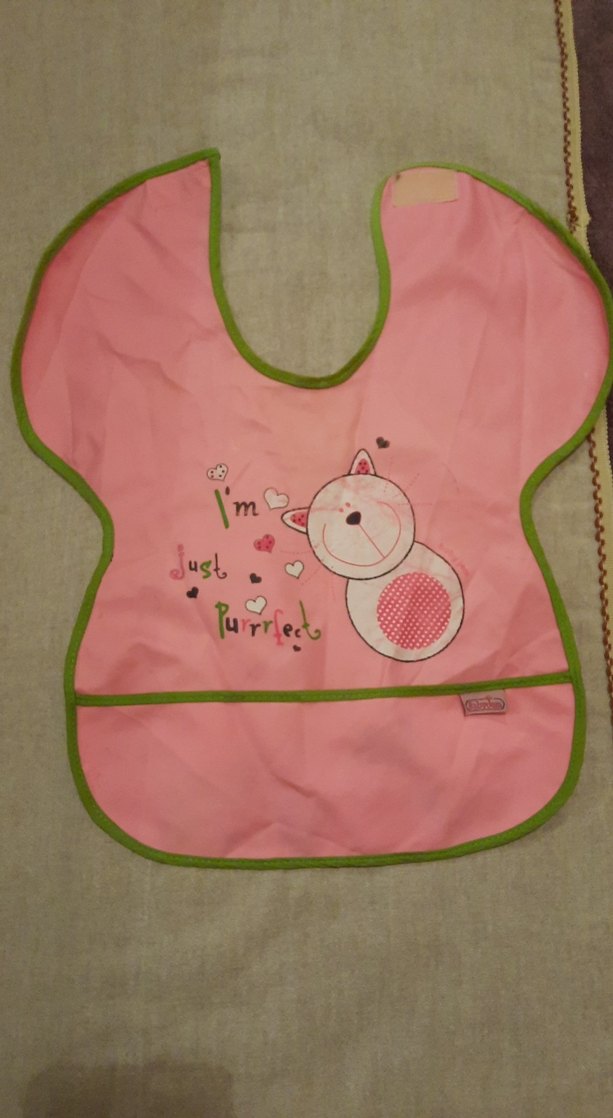 Pastel pembe renkli, baskılı kedi desenli bebek önlüğü. Yeşil kenarlığı ve alt kısmında cep bulunuyor.