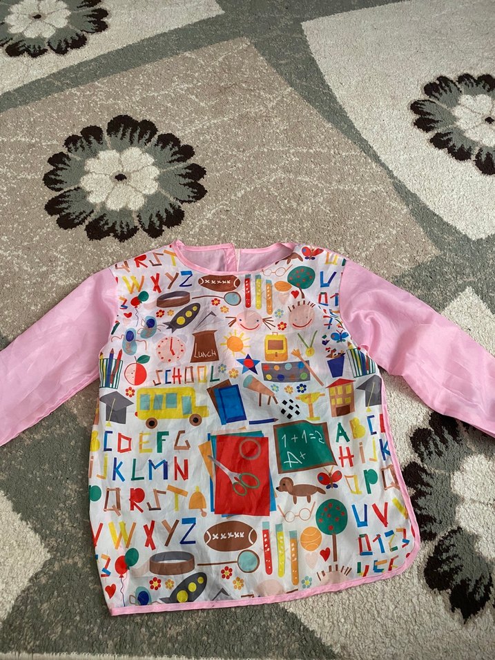 Pastel pembe uzun kollu, üzerinde harfler ve okul temalı renkli baskılar bulunan bebek önlüğü. Üzerinde 'KLMN' yazısı var.