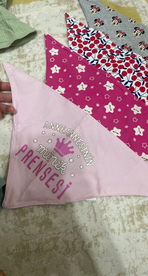 Pastel pembe renkte, üzerinde "mini prenses" yazılı ve taç desenli baskılı bebek önlüğü. Yumuşak ve rahat kullanıma uygun.
