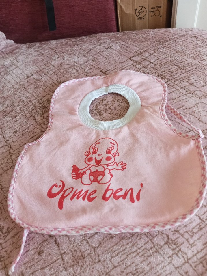 Pastel pembe renkli, baskılı, yuvarlak yaka açıklıklı ve yumuşak kumaşlı bebek önlüğü. Üzerinde sevimli bebek çizimi ve "Opme beni" yazısı bulunur.