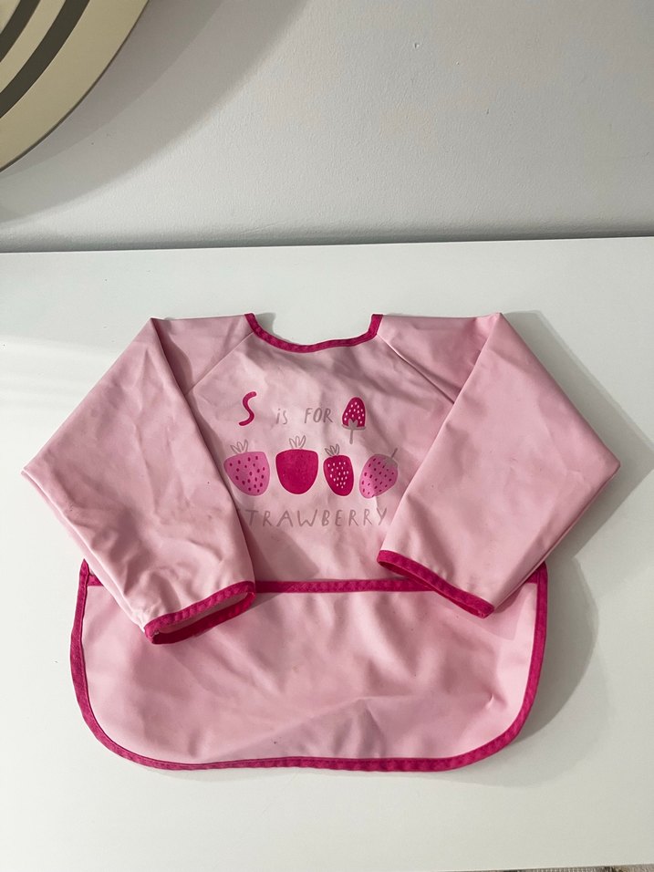 Pastel pembe renkli uzun kollu bebek önlüğü, üzerinde 'S is for Strawberry' yazılı çilek baskısı vardır. Su geçirmez ön yüzey ve lastikli manşetler içerir.