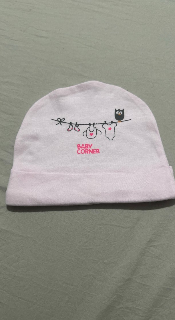 Pastel pembe renkte, üzerinde bebek kıyafetleri ve baykuş baskısı bulunan "BABY CORNER" yazılı bebek önlüğü. BARNER markalı.