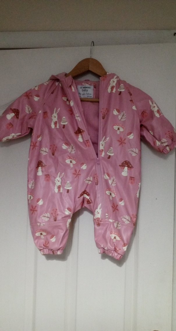 Pastel pembe, baskılı bebek tulumu, önden fermuarlı ve yuvarlak yakalı. Yumuşak kumaşlı, sıcak tutar.