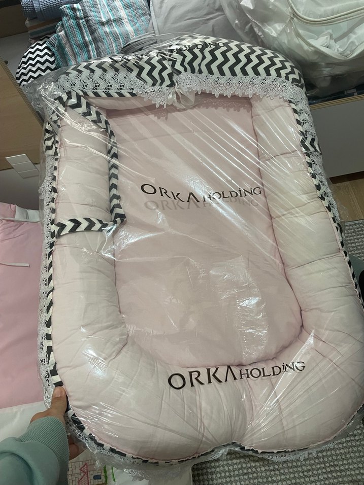 Pembe baskılı bebek uyku yatağı, yumuşak sentetik kumaştan yapılmıştır. Yanlarda zigzag desen ve dantel detayları bulunur. ORKAHOLDING markalıdır. ️hiç kullanılmamış emzirme yastığı ve puset örtüsü dahildir