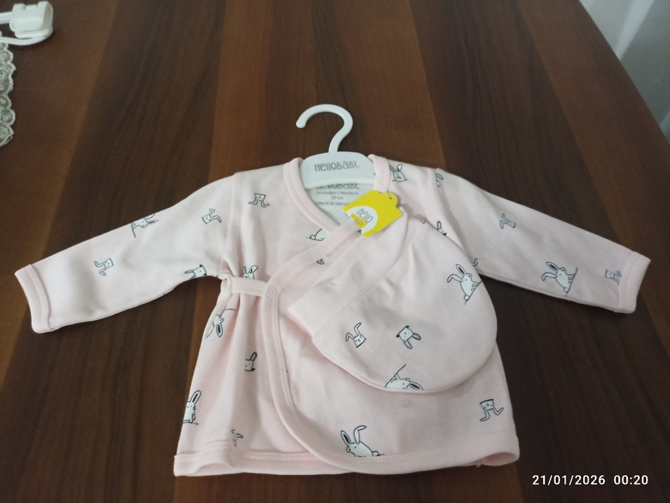Yumuşak pembe, baskılı tavşan desenli, düğmeli bebek hastane kıyafeti pamuklu kaliteli