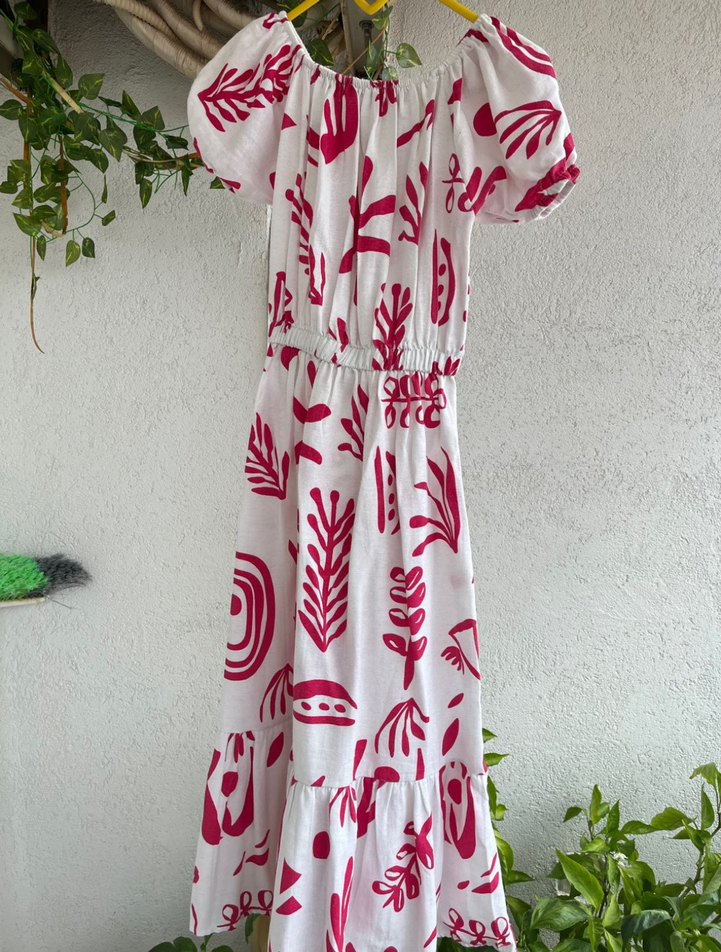 Uzun, bol kesim elbise, renkli pembe baskılar, tekne yaka ve kısa fırfırlı kollara sahip, bohem tarzı için uygun. S m L