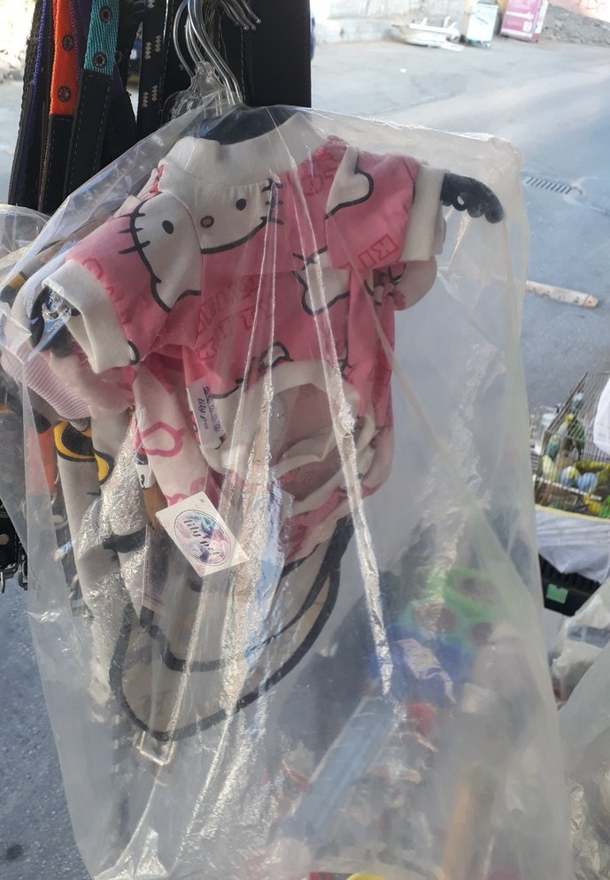 Pastel pembe renkte, baskılı desenlere ve cırt cırtlı kapanışa sahip streetwear tarzında kedi kıyafeti.