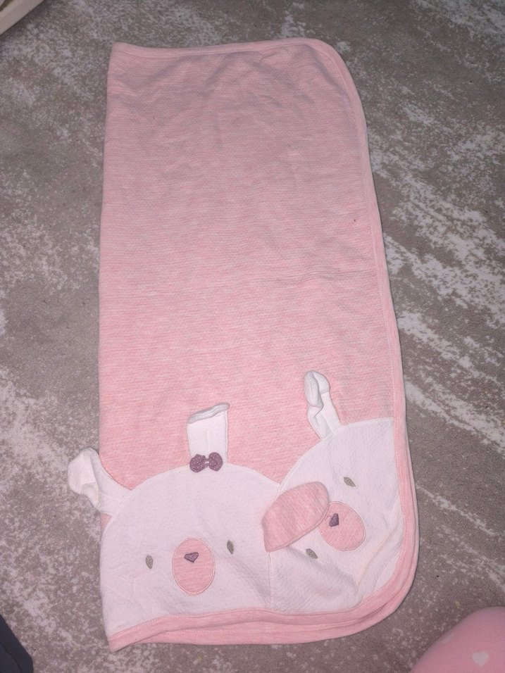 Pastel pembe renkte, yumuşak ve sıcak kumaştan yapılmış çocuk battaniyesi. Ucunda sevimli hayvan yüzleri baskılıdır.